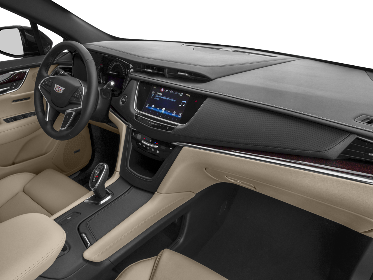 - Cadillac CUE Information and Media Control System with Embedded Navigation, AM/FM stereo with 8" diagonal color information display, four USB ports, two auxiliary power outlets, auxiliary input jack, Natural Voice Recognition and Phone Integration for Apple CarPlay and Android Auto capability for compatible phone